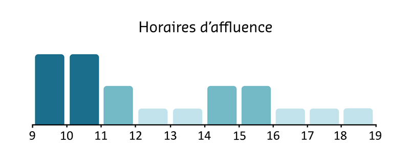 Afin de vous aider, vous trouverez ci-dessous un schéma indiquant les heures d’affluence : il vous permettra de choisir le bon créneau et d’éviter une trop longue attente.