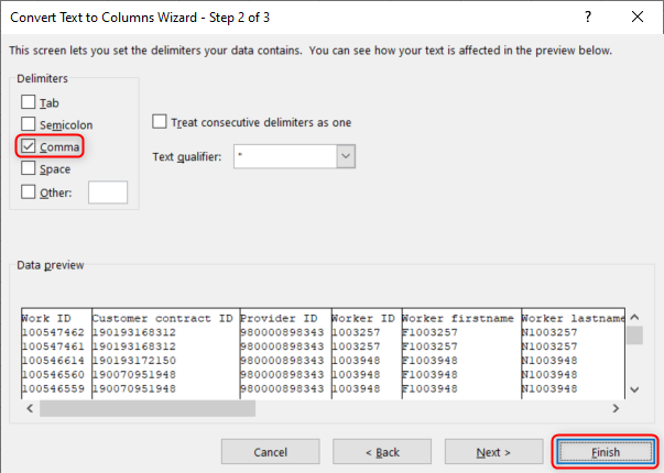 - Dans « Délimiteurs », sélectionnez « virgule », puis cliquez sur « terminer » ;